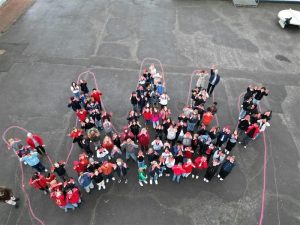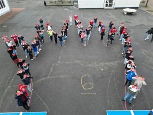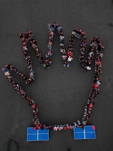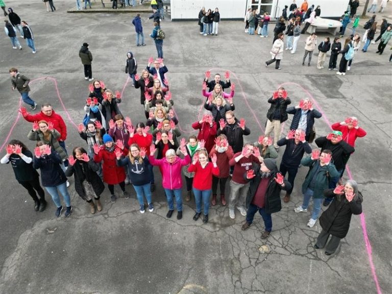 in diesem Jahr hat die Eichendorffschule Wolfsburg 2000 Hände ihrer Schüler, Lehrer und Mitarbeiter rot gefärbt. Dann haben sich die einzelnen Jahrgänge auf dem Schulhof zusammengefunden, um sich in Form einer Hand aufzustellen. Ein Schüler des 12. Jahrgangs hat dieses mit einer Drohne dokumentiert.