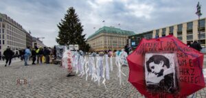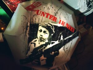Im Hintergrund ist das Seil mit weißen Bändern zu sehen. Wir laden dazu ein einen Friedenswunsch auf ein Stück weißes Band zu schreiben. Auf dem anderen ein Schirm gemacht von Ute für die Installation am Red Hand Day, sie wird einige davon machen.
